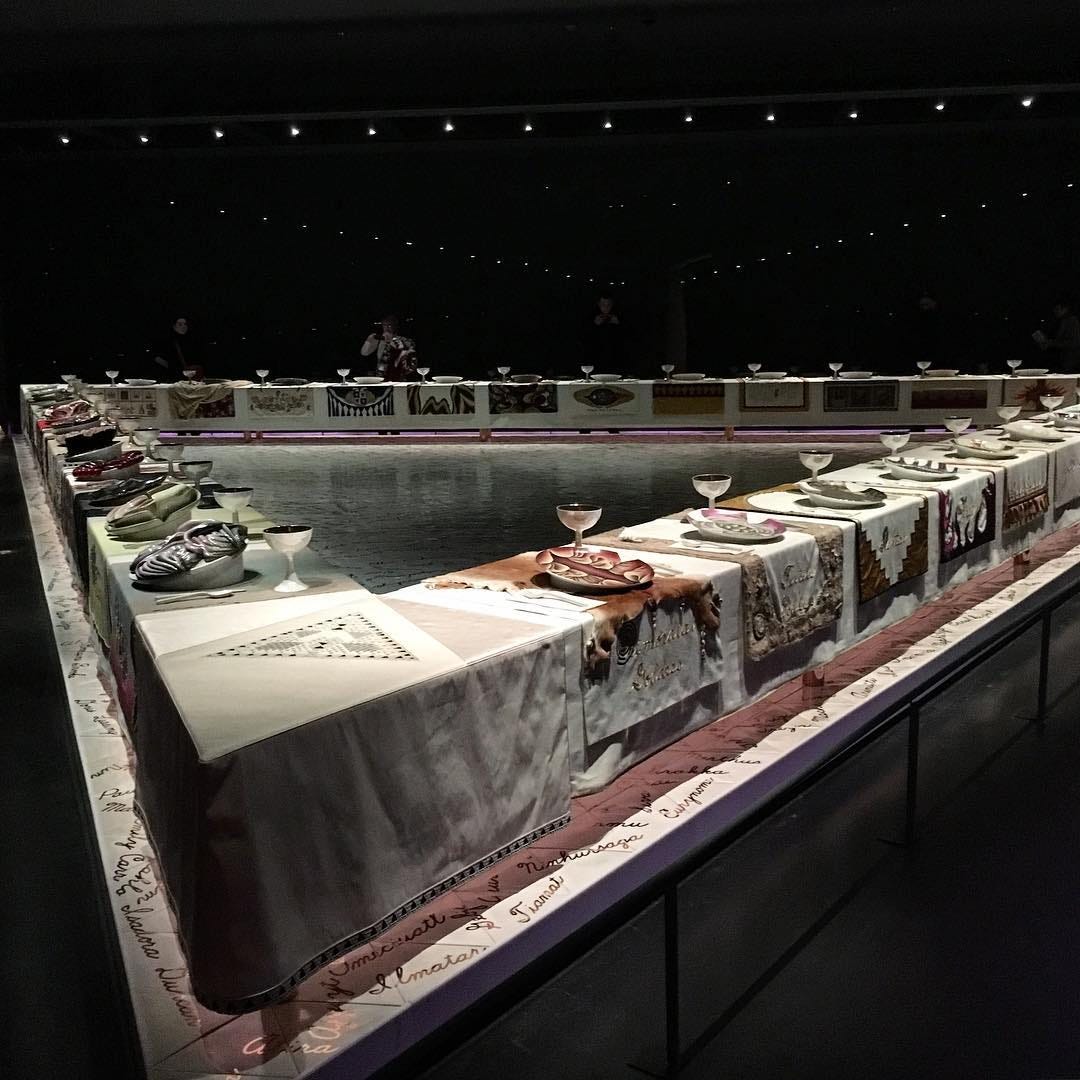 The museum’s crown jewel, Judy Chicago’s iconic 1979 installation The Dinner Party, was similarly impossible to find. I wandered through the labyrinthine fourth floor before spotting a sign for the Elizabeth A. Sackler Center for Feminist Art. The first room I entered had no artwork except, inexplicably, Auguste Rodin’s The Burghers of Calais. This sculpture is currently paired with Nicole Eisenman’s Three Walkers, but lacking this information, I thought I was in the wrong place.